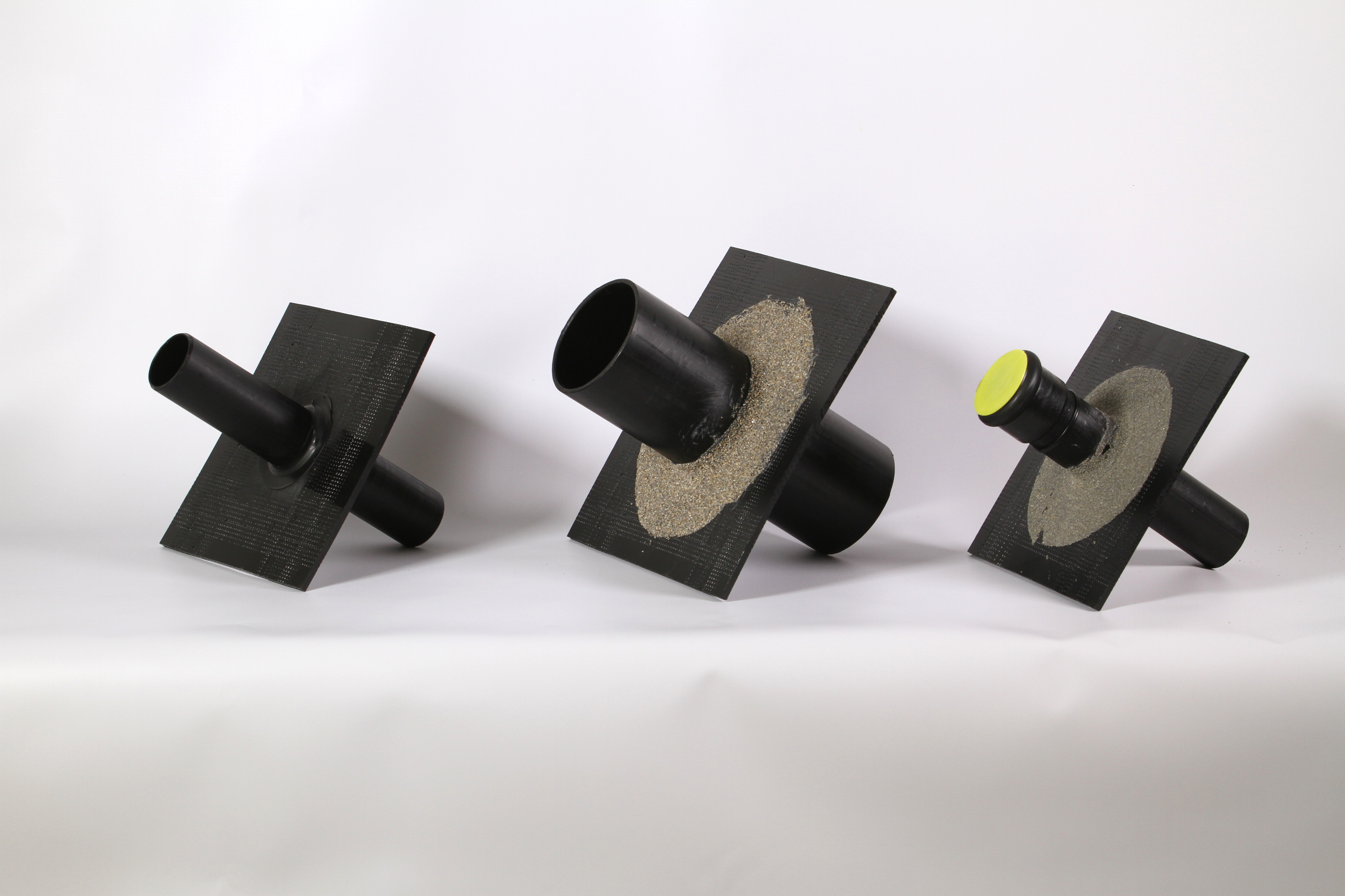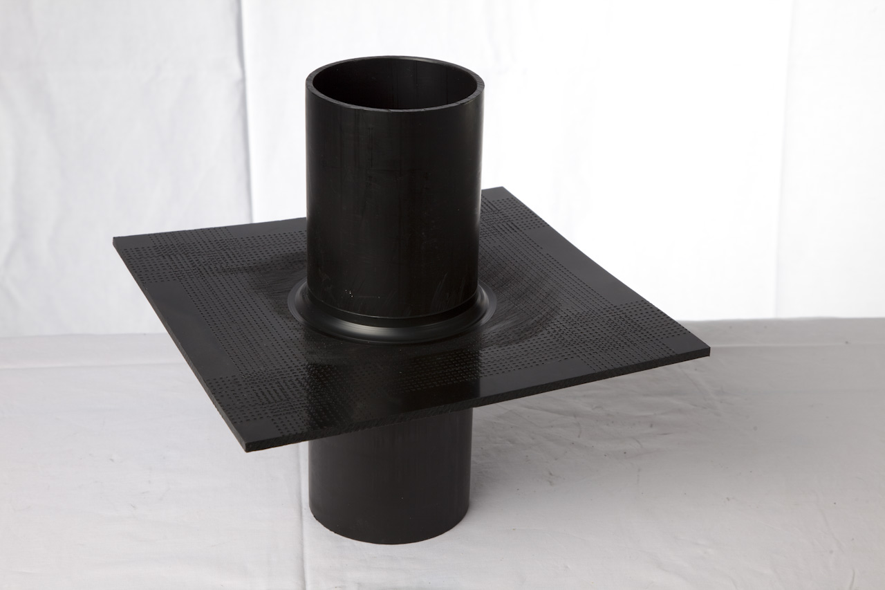 Unsere Bodenplatten- und Mauerdurchführung aus PE-Material mit mittig aufgeschweisstem Dichtflansch, Längen 300 mm, mit stumpfen Rohrenden.